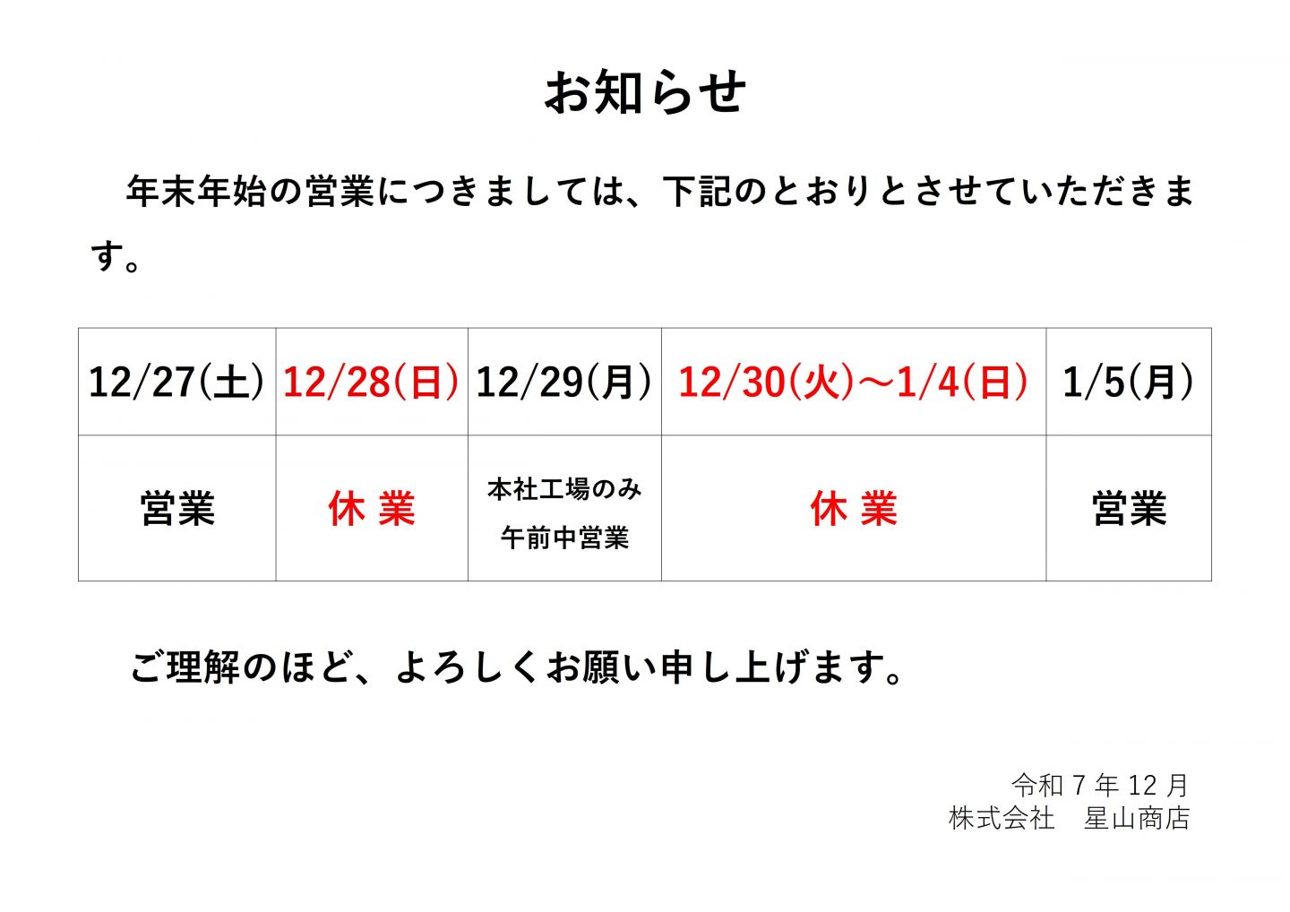 2025年12月25日 お知らせ 年末年始の営業についてのお知らせ 平素より格別のご高配を賜り、厚く御礼申し上げます。 誠に勝手ではありますが、年末年始の営業は下記の通りとさせていただきます。 皆様には大変ご迷惑をおかけいたしますが、何卒ご理解くださいますようお願い申し上げます。